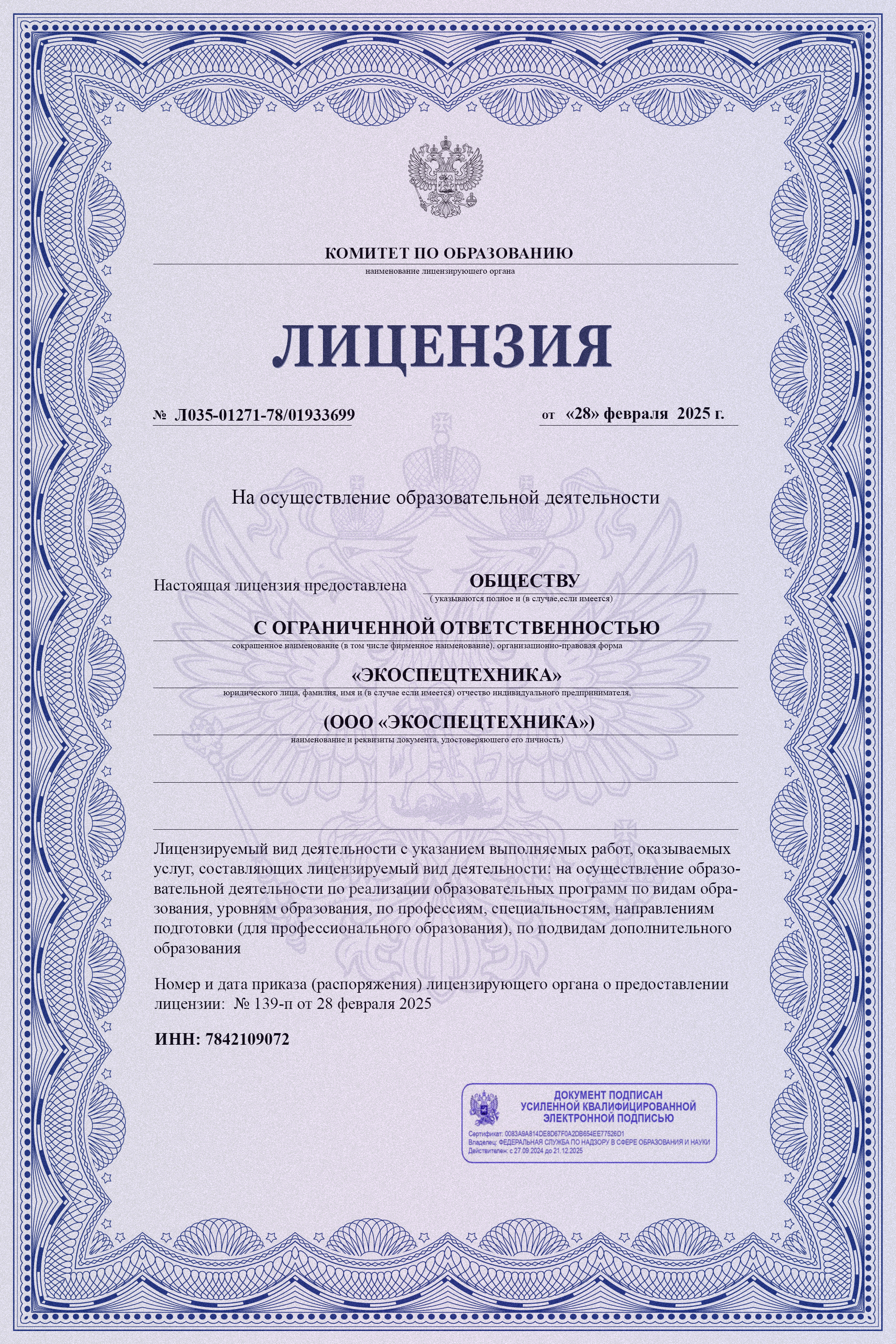 ООО "Экоспецтехника" имеет лицензию на образовательную деятельность по программам - Дополнительного профессионального образования и Дополнительного образования